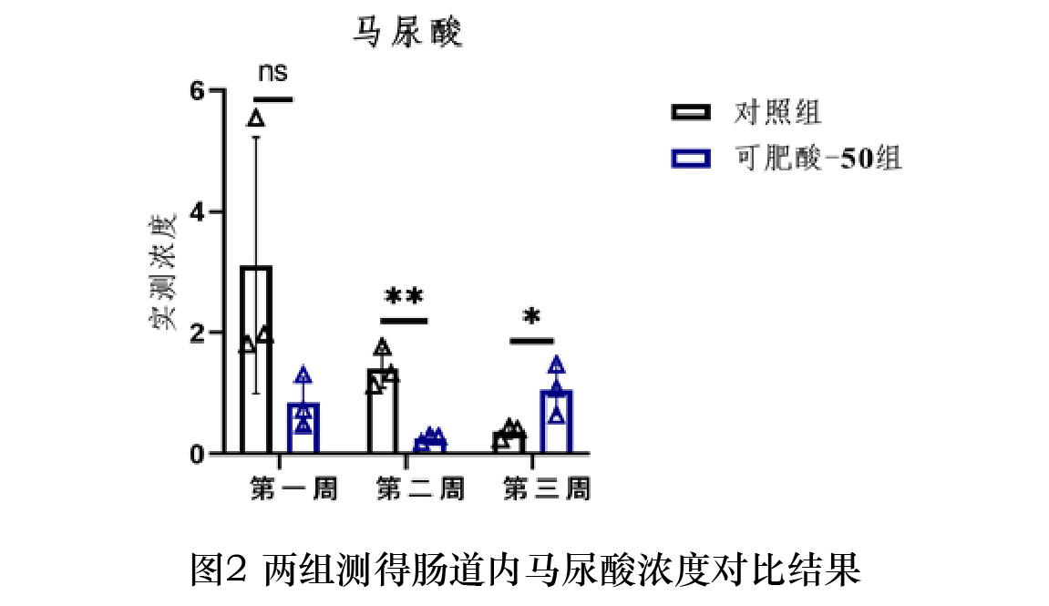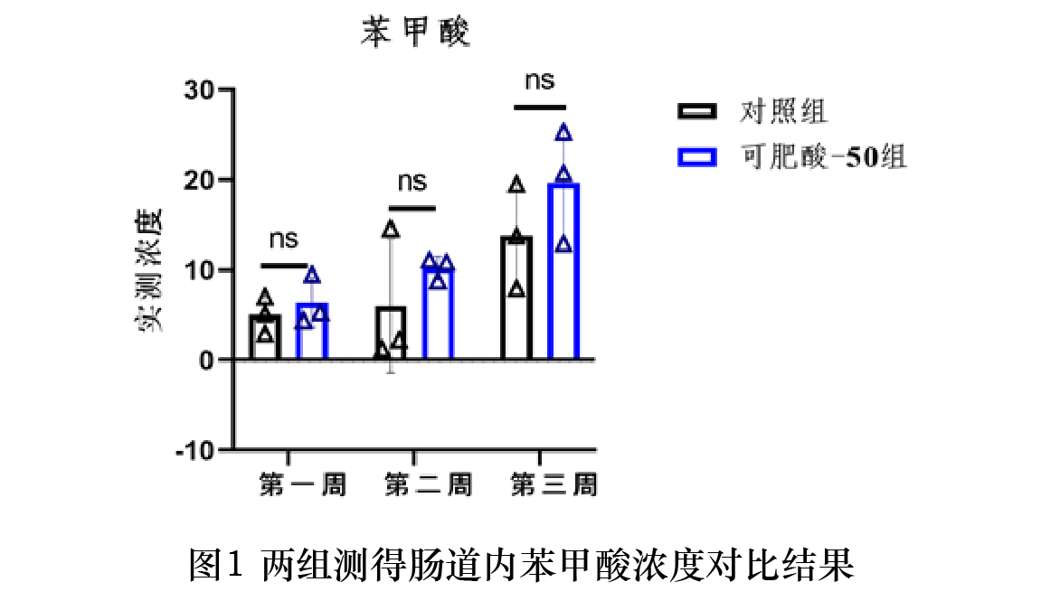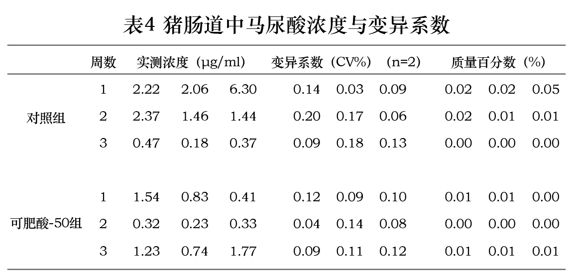 在1月龄仔猪饲料中添加1670 mg/kg可肥酸-50,连续饲喂三周,给药后第7、14、21天采集小肠后1/4段的内容物,测得苯甲酸的浓度在三个时间点均高于添加5000 mg/kg苯甲酸(对照组),但差异不显著;在第7天测得可肥酸-50组肠道内马尿酸的浓度低于对照组,但差异不显著,第14天测得可肥酸-50组肠道内马尿酸浓度显著低于对照组,而在21天时小肠内容物中马尿酸的浓度显著高于对照组。
