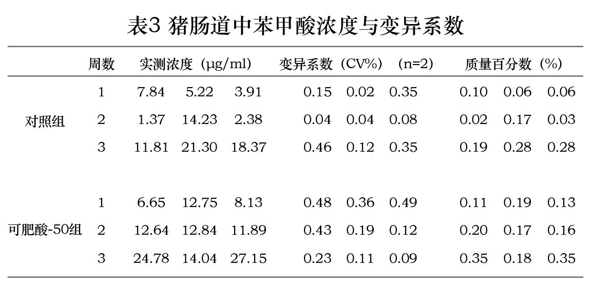 1.8 动物试验实测方案 18头猪,体重约10kg,如表1随机均分为2组,饲料中分别添加苯甲酸或可肥酸-50,连续饲养3周。试验期间自由饮水和采食。另备三头作为空白组,饲养一周后采样检测。
