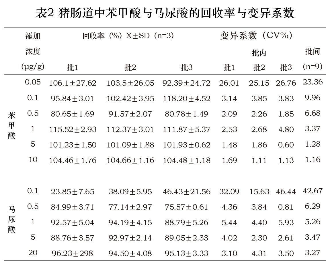 2.1.4 回收率和精密度 苯甲酸(马尿酸)在肠内容物10、5 、1、0.5 和0.1 µg/g五个添加浓度下,其回收率及精密度测定结果见表2。除苯甲酸添加0.05µg/g和马尿酸添加0.1µg/g浓度外,回收率均大于75.57%,日内和日间变异系数分别小于5.93%和9.96%。