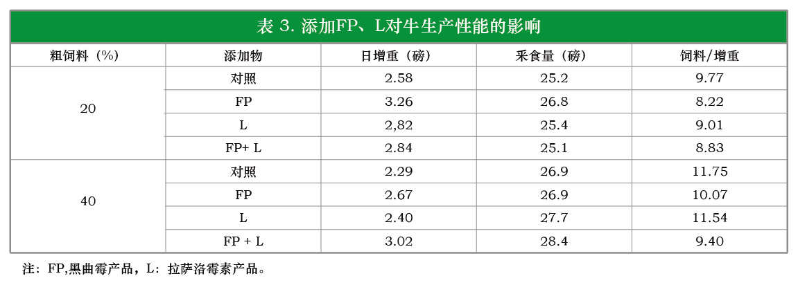 在拉萨洛霉素研究中,日粮含10%与前相同的蛋白质补充料和70%玉米粉与20%草地干草或50%玉米粉与40%草地干草。72头平均始重606磅的杂种肉牛平均饲养102天。按17克/头/日加喂黑曲霉产品和按315毫克/头/日加喂拉萨洛霉素。将2个粗饲料水平(20%与40%)合起来计算时,4种添加处理组(对照、黑曲霉产品、拉萨洛霉素、黑曲霉产品+拉萨洛霉素)的平均日增重分别为2.44、2.97、2.61和2.93磅。相应的日釆食量为26.1、26.9、26.6和26.8磅,饲料效率为10.70、 9.06, 10.19和9.15。