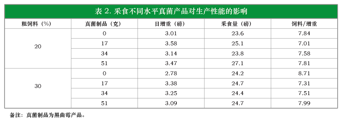 在各种粗饲料采食量范围内,都会出现饲喂真菌制品的有利反应。表1中的数据是从釆食全玉米和颗粒补充料的杂交肉牛的委托研究中获得的,没有供给粗饲料。牛采食添加了黑曲霉产品的饲料后,增重提高12.8%, 每千克增重的饲料消耗减少7.5%。