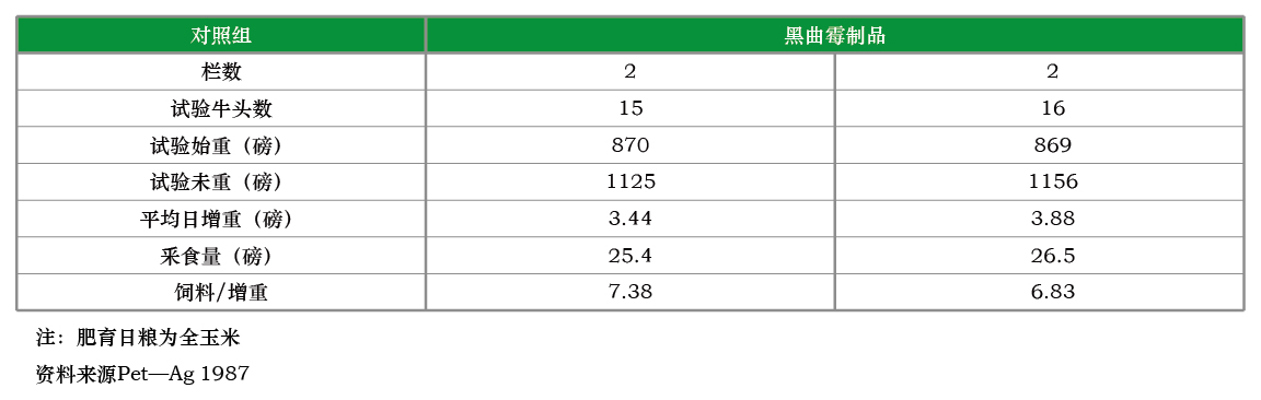 在1983年的试验中,肉用生长公牛日粮中含有黑曲霉导致增重提高12.5%,单位增重的耗料量少10.5%。很多委托研究和牧场研究(Pet-Ag饲料产品研究与开发利用, 1988)表明,在断乳幼年肉牛日粮中加入黑曲酶制品,提高增重速度10.2%,改善饲料效率9.7%;在肥育期加入黑曲霉制品,分别改善8.8%和10.4%。羔羊也有相似的效应。